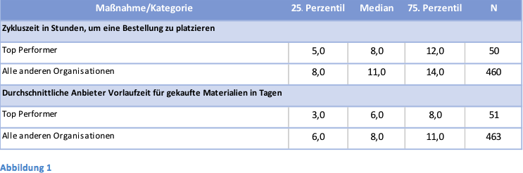 Top-Performer in der Beschaffung benötigen weniger Zeit zur Platzierung von Bestellungen an die Lieferanten, haben niedrigere Lieferzeiten und benötigen weniger Zeit, um ihre Lieferanten zu bezahlen. Die überlegene Leistung dieser Unternehmungen wurde durch Prozessverbesserungen über die gesamte Beschaffungsfunktion erreicht. Diese Verbesserungen wurden auch auf die Lieferanten ausgedehnt, um eine schnellere Auslieferung der Waren zu ermöglichen.