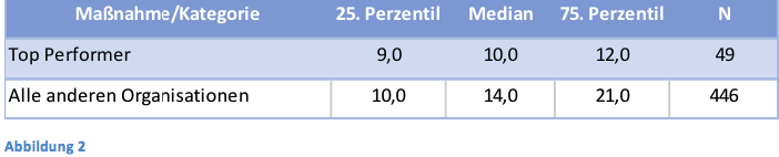 Des Weiteren haben Top-Performer haben auch kürzere Lieferzeiten von ihren Lieferanten. Wie Abbildung 1 zeigt, erhalten diese Unternehmungen (im Median), Lieferungen 2 Tage früher als die anderen Unternehmungen. Die Lieferzeit kann aufgrund von verschiedenen Faktoren, wie z.B. die Art des Materials oder die Entfernung des Lieferanten variieren. Allerdings performen Top-Performer in der Beschaffung besser als die anderen Unternehmungen. Der Unterschied zwischen den beiden Gruppen beträgt drei Tage sowohl im 25. Perzentil und auch dem 75. Perzentil.