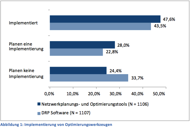 Gemäß den Open Standards Benchmarking-Daten von APQC in der Logistik wurde jedes dieser Systeme in geringem Umfang von Organisationen implementiert. Wie in Abbildung 1 gezeigt wird, haben weniger als die Hälfte der antwortenden Organisationen, Netzwerkplanungs- und -Optimierungstools implementiert. Jedoch plant ungefähr ein Viertel dieser Organisationen, diese Systeme in der Zukunft einzuführen. Organisationen reagierten ähnlich wenn sie gefragt wurden ob sie DRP-Software übernommen hätten.