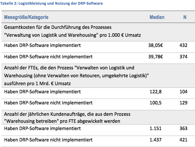 Wie Tabelle 2 zeigt, haben Organisationen, die eine DRP-Software implementiert haben, einen geringen Kostenvorteil gegenüber Organisationen, die dies nicht getan haben. Im Median geben sie 1,73€ weniger pro 1.000€ Umsatz für ihre Logistik- und Lagerbemühungen aus als ihre Konkurrenz. Für die Beispielorganisation mit einem Jahresumsatz von 1 Mrd. € bedeutet dies ein Einsparpotenzial von über 1,7 Mio. € für die Logistik.